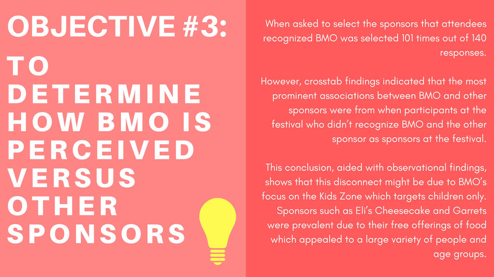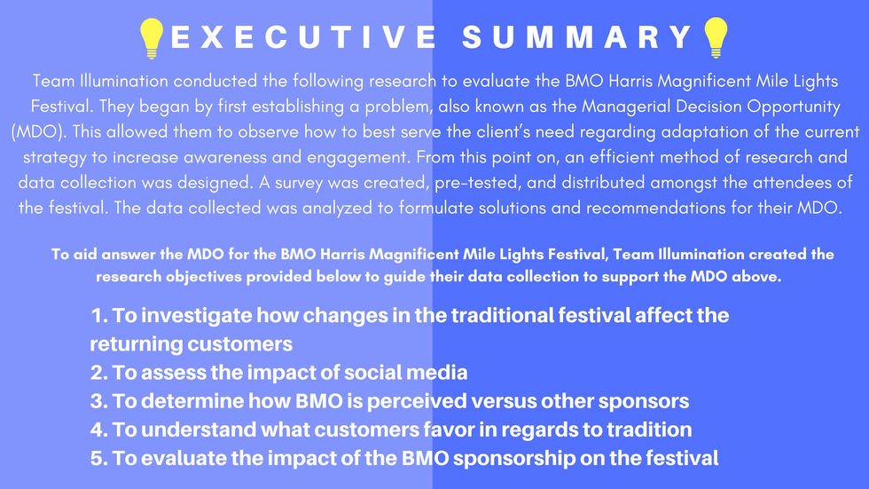 The BMO Harris Magnificent Mile Lights Festival is a parade that kicks off the holiday season in Chicago. This family oriented festival draws in tourists and locals alike, visit one of many sponsored attractions. BMO Harris Magnificent Mile Festival works to deepen their usage of social media. Last year, it achieved a record breaking 500 thousand uses of its snapchat filter, along with 17.8 million impressions on Facebook, and overall 919 million media impressions, an influx that drew in new visitors to the festival aiding BMO Harris in their goal to increase attendance. Based on factors that were stressed during our interview, we've identified a desire within BMO Harris to enhance the event in order to attract more millennials without losing the tradition that their reoccurring attendees have grown to love.The managerial decision opportunity (MDO) proposed to guide the marketing research deliverables was What factors does BMO need to adapt to increase awareness and engagement?
